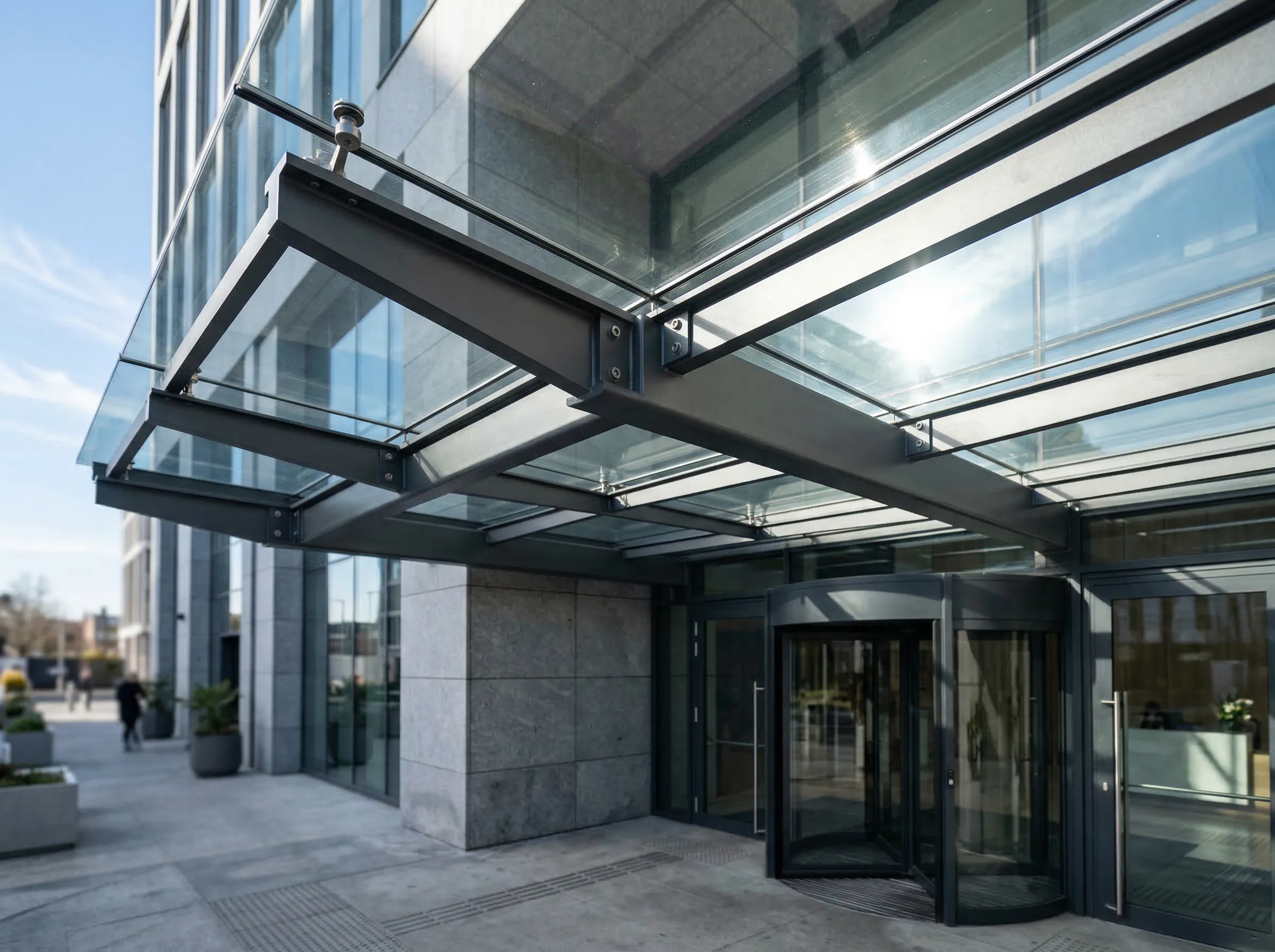 Aluminium and glass canopy systems enhance the visual appeal of commercial and residential buildings.